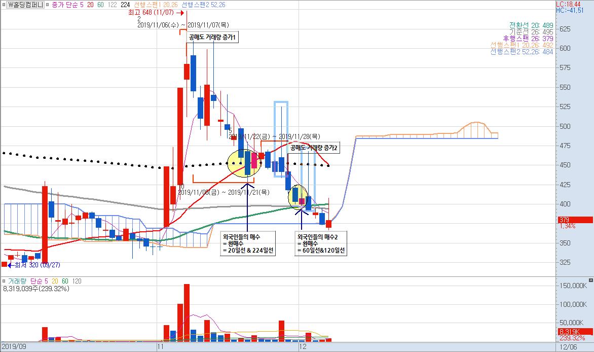 11월 6일 ~ 11월 18일 까지 공매도 거래량이 터져줍니다.