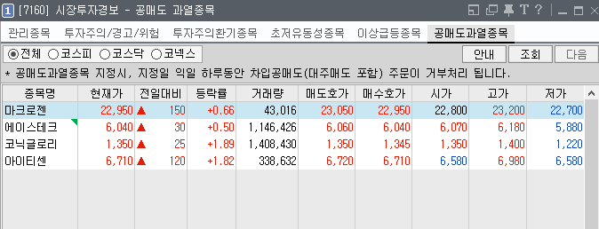 - 공매도 비중이 과도, 전일 대비 주가 변동이 크거나, 공매도 증가율이 급등하는 경우 해당종목은 공매도 과열종목으로 지정되어 공매도 거래가 금지되는 제도입니다.