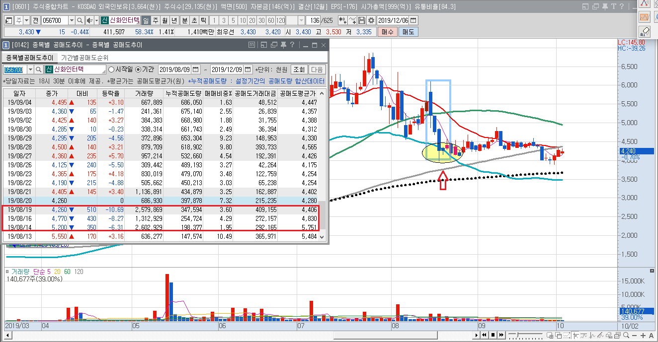 평상시 공매 거래량보다 눈에 띄게 들어왔었고, 하락 음봉 캔들이 만들어짐과 동시에 나오는 공매 거래량입니다.