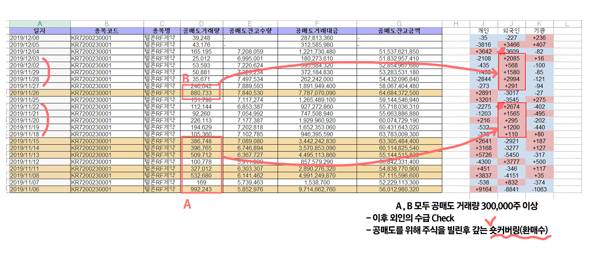 저는 이러한 공매도 거래량 급증 -> 외인/기관 매수 -> 매수 기준 -> 짧은 단기스윙 의 기준을 갖고있으며,