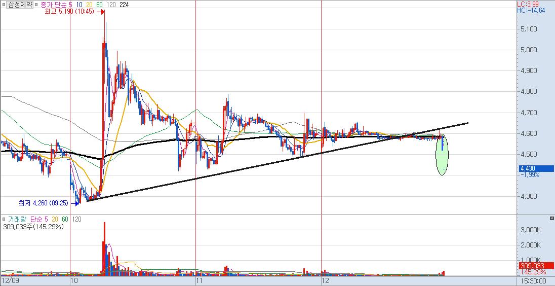삼성제약은 오늘 저가 4,430 원, 종가 4,430 원으로써 종가저가 캔들이 등장을 하였네요.