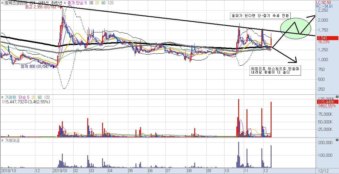 토박스 코리아는 하방으로 박스권을 만들며 내려갈 확률이 높으며, 횡보를 통한 조정국면을 맞이할 확률이 높아보이는 차트입니다.