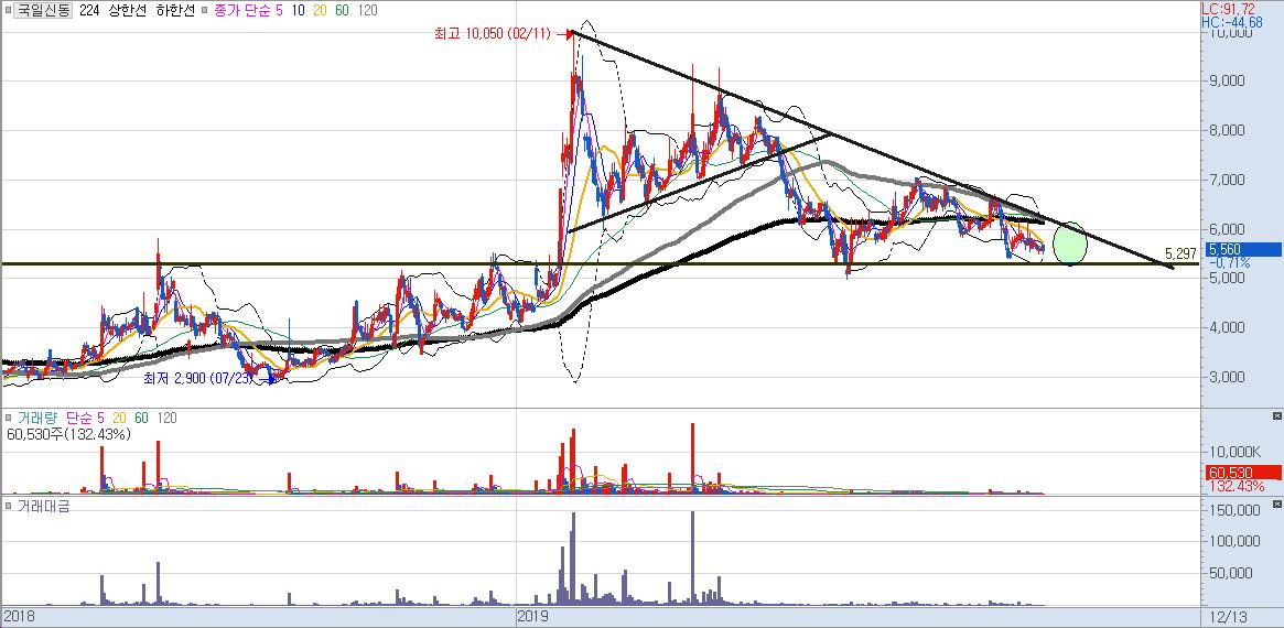 이후 국일신동은 상승한 만큼(깃대 높이) 하락을 하였다가, 2019년 한해를 하락삼각형 패턴을 만들면서 다시 수렴구도로 가고 있습니다.