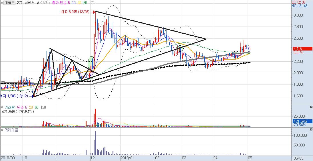 국일신동은 2019년 1월 부터 엄청난 상승파도이 발생하며 고점에서 대칭삼각형 패턴을 만들며 수렴하였다가,