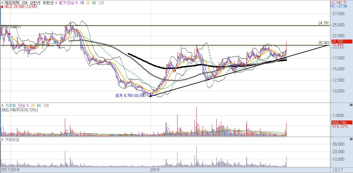 케이씨텍도 마찬가지로 오늘 20,000원 대를 강한 양봉으로 돌파를 해주면서 전형적인 상승 삼각형, 돌파흐름이 나왔습니다. 여전히 추세는 좋은 것으로 판단은 되어지지만, 당장 타점을 잡을 매수시점은 아닙니다.