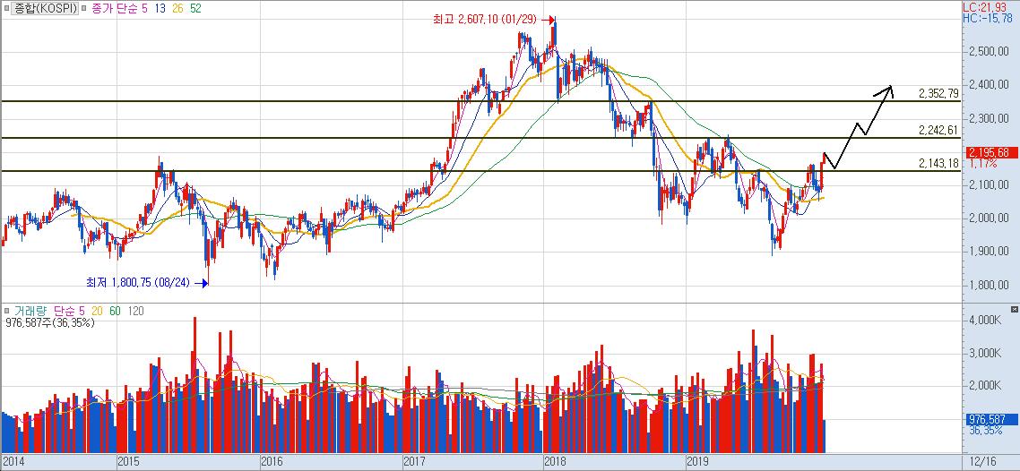 코스피 차트의 경우는 어느정도 가파른 상승 파동이 나와주면서 변곡에 성공한 것으로 보입니다.