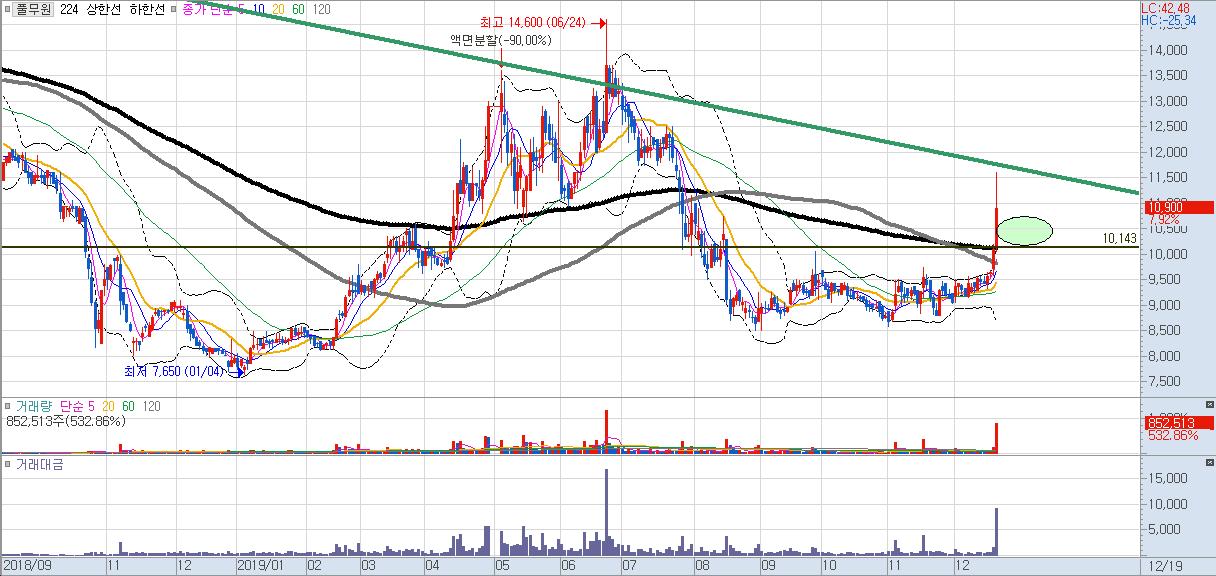박원순 관련주인 풀무원 입니다. 2거래일 동안 매수시점이 되었고, 추후 초록색 원 부분이 매수타점으로 노려볼만 하겠습니다. 전매물대에 꼬리를 만들며 내려오는 모양새지만, 지속적으로 거래량이 터져준다면 충분히 시세가 나올 수 있는 자리가 되겠습니다.