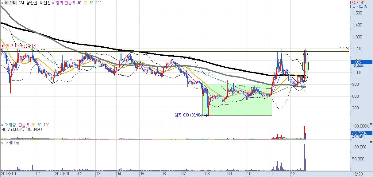 이에스에이 갭 하락을 보여주며 거의 하락 폭포수의 정점을 보여줍니다. 인수합병 내용으로 급등했었는데..