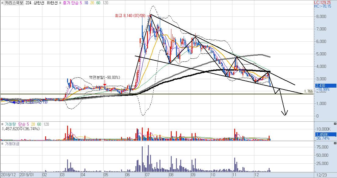 카리스 국보도 오늘 저점을 깨며 하락이 나옵니다.