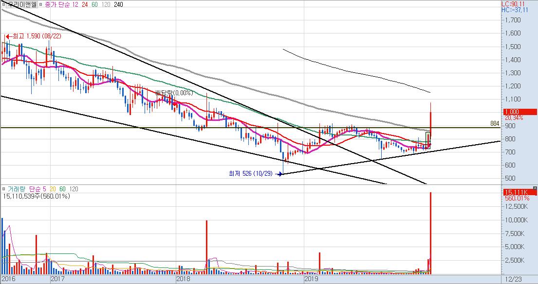 5G 관련주로 편입을 하나 싶었는데, 오늘 하락쐐기형 패턴에 갭하락 까지 나오며 바닥을 알 수 없는 수준까지 되어버렸습니다. 이미 최후 지지선까지 다 뚫어버린 갭하락이기 때문에 물론 어느정도 기술적 반등이 나올 수 있는 자리기는 합니다.