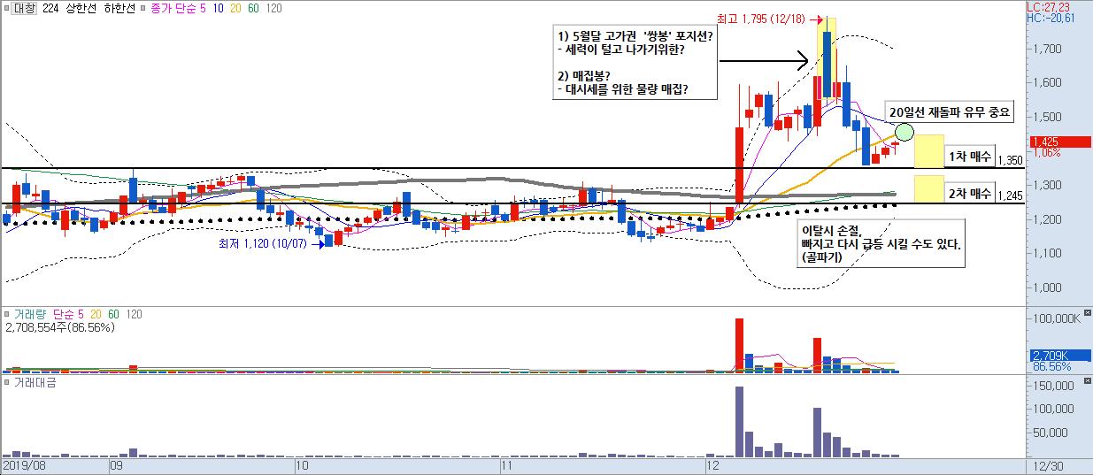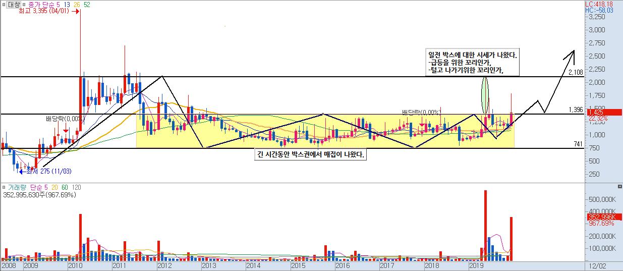 항상 말씀드리는 것이지만, 최소한 주봉->일봉 순으로 살펴보시는게 스윙트레이딩을 추구하시는 투자자분들에겐 정말 좋습니다. 오늘은 대창 월봉 차트도 한번 가져와봤는데, 제 기준 해석이니 본인들의 시나리오를 한번 살펴보시기 바라겠습니다.
