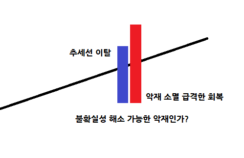 이전 과거 차트들을 한번 보세요. 악재가 등장을 하더라도 해당 악재에 대한 불확실성이 해결될 수 있는 시나리오가 나온다면, 본인이 조금 더 손절 기준에 있어 예외를 둘 수가 있습니다.