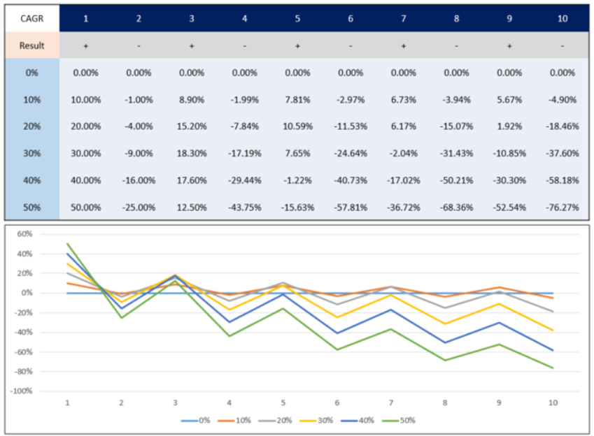 올해는 10% 수익 내년에는 -10% 손실, 이렇게 변동성을 부여하여 계좌를 운영하게 되면, 결론적으로는 계좌는 마이너스를 향해 가게 됩니다. 10% 이상 즉 고 수익으로 가면 갈수록 변동성으로 인하여 손실폭 또한 더욱 커지게 되지요.