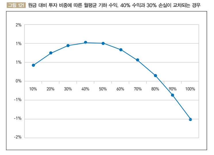 기하평균의 성질이 결국 '투자비중'을 조절하면 극복이 가능하다는 결론이 나오게됩니다.