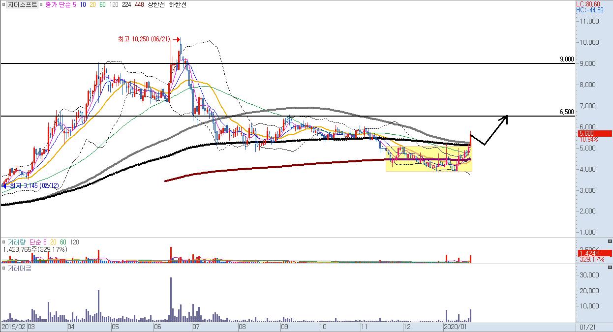 : 지어소프트 일봉차트는 기술적 반등을 노려보고, 짧게 6,500원까지는 수익을 노려볼 수 있는 구간