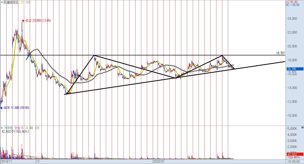 이전 차트는 참 좋게 흘러가고 있었는데, 한올바이오파마의 파이프라인 HL036(안구건조증)이 유의성을 달성 못하면서 실패로 마무리가 되었습니다. 코스닥의 조정에도 일조를 했겠으나, 세부적으로보면 바이오 섹터의 전체적인 하락에 기름을 부었다고 볼 수 있겠네요.