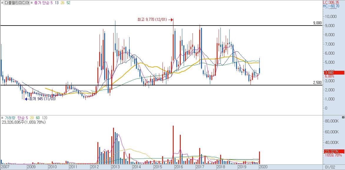 똑같이 월봉 박스권은 표시해둔 상태에서 주봉차트상 작년 하반기에 유의미한 움직임을 보여준 다믈멀티미디어 입니다.