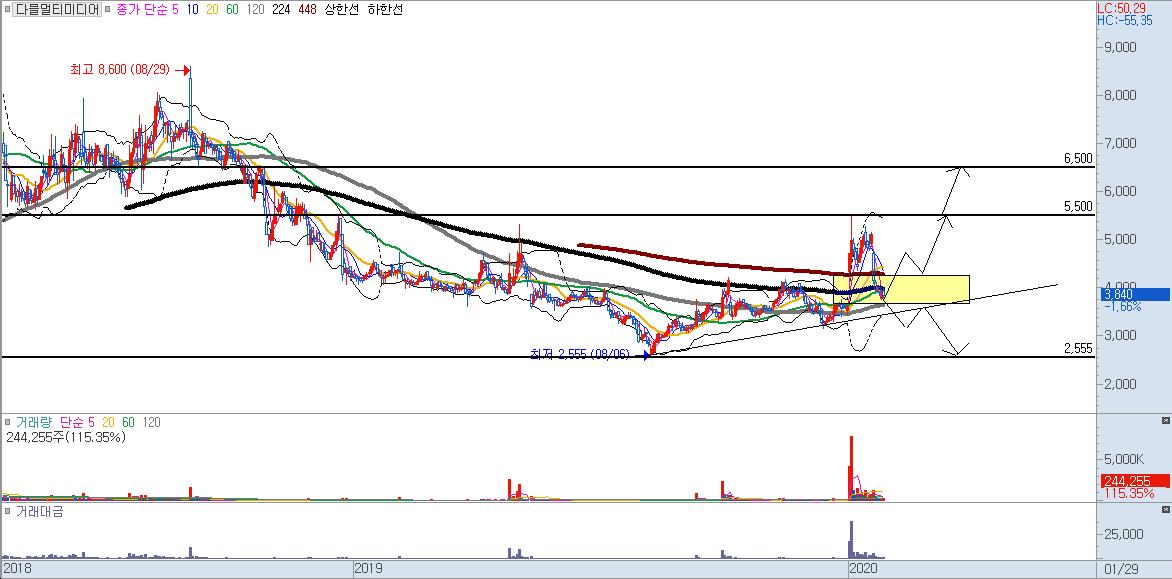 2018년 하반기부터 5,500원~ 9,000원 박스에서 시세를 형성하던 다믈멀티미디어 주가는 2018년 10월달부터 지속적인 하락추세에 돌입을 하게 됩니다. 2018년 말~ 2019년 초까지 하락쐐기형 패턴이 나와주며, 2019년 8월 2,555원 최저점을 찍고 다시 추세변곡에 돌입하여 상승 삼각형 패턴 등장, 5,500원까지 시세가 나와주었네요.