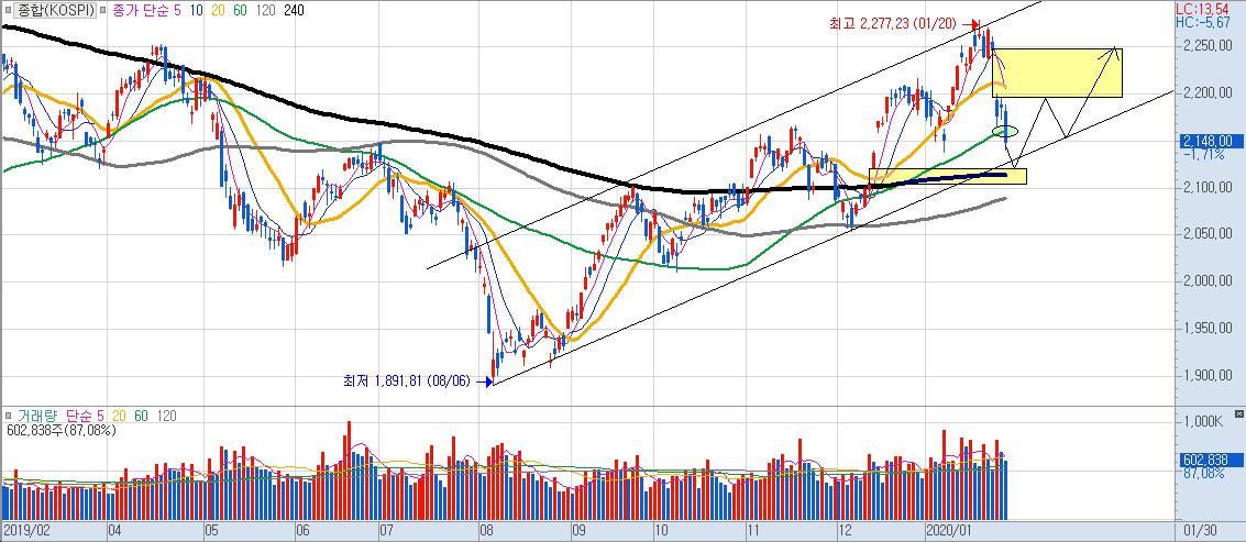 하지만 현재 증시 수급 추이로 볼때는 정말 우한 폐렴을 단기적으로라도 이길 수 있는 재료가 나오지 않는 경우 전저점을 이탈할 확률이 높으며, 당장 내일 이탈 할 가능성도 있습니다.