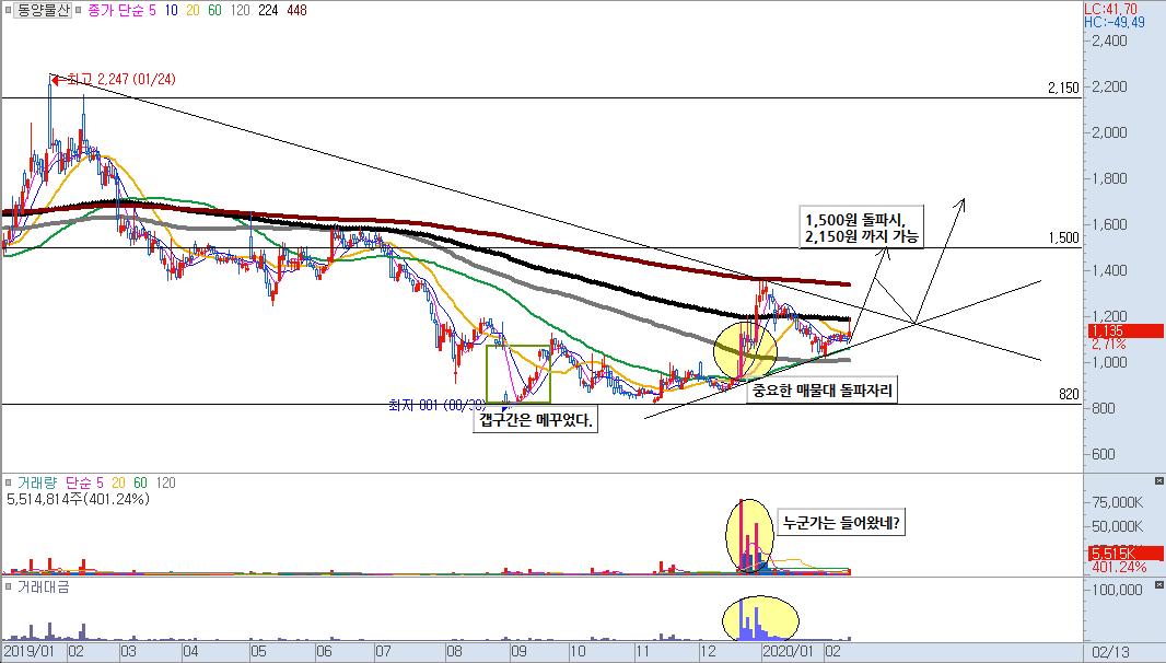 주봉에서 언급하였듯 1,500원 돌파 이후에는 2,150원까지도 시세를 노려볼 수 있겠습니다. 물론 시간조정이 얼마나 나올지는 모르겠지만요.