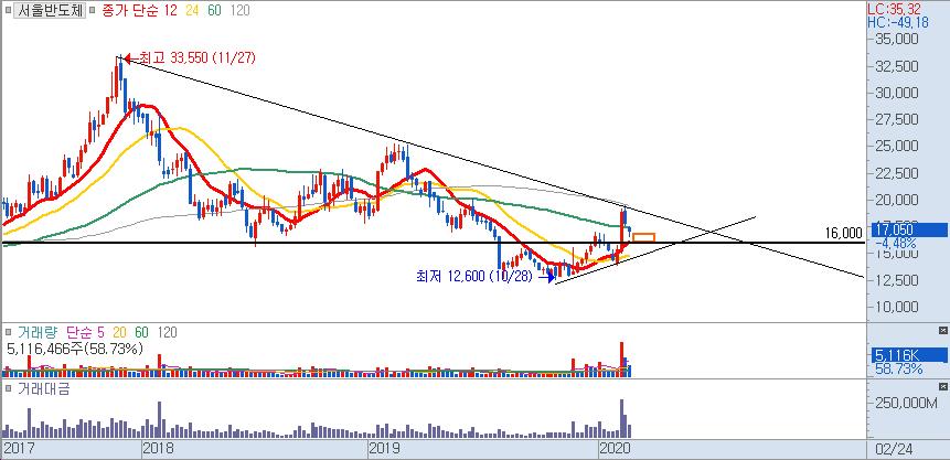 2019년 동안 서울반도체는 지속적인 하락추세에 있으면서 힘겨운 시간을 충분히 보냈고, 2020년들어 밝은 전망과 함께 최대 1차 21,500원 2차 24,000원 구간까지는 기간은 얼마나 걸릴지는 알 수 없으나 가격적인 부분에서는 열려있다고 볼 수 있겠네요.