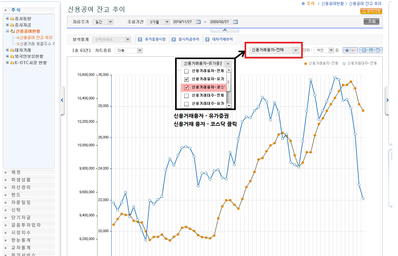신용거래대주와 융자가 같이 표시되어 있는데, 빨간박스를 클릭,