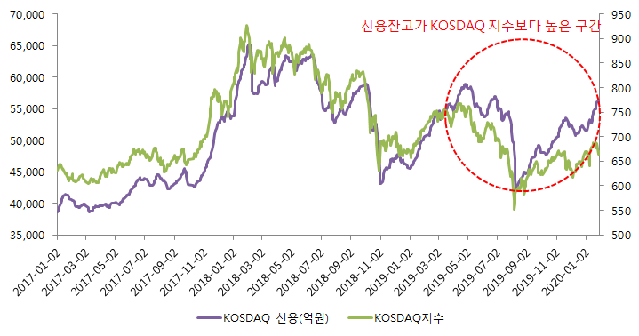 2019년 9월부터 코스피 지수가 상승하면서 신용잔고도 높아지고 있으며,