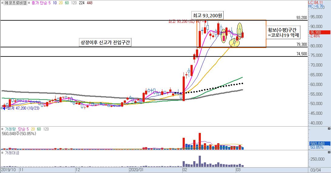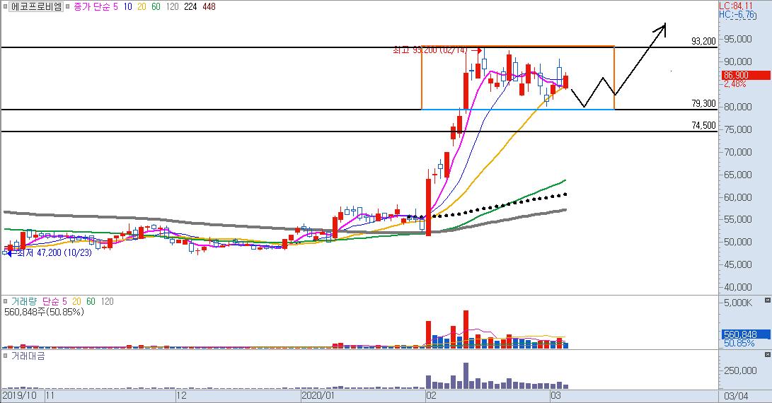 코로나19 가 한국증시에 큰 악재로 작용을 하면서 증시가 급락하는 기간동안에도 79,300~최고점 93,200원 에서 박스구간을 만들면서 어느정도 매물 소화과정을 거치고 있는 것으로 보여집니다.
