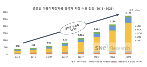 위의 수요 전망을 확인해보더라도, NCA 이외에 NCM(니켈,코발트,망간) 양극재의 수요가 2018년 기준 43% 로써 가장 많은 비중을 차지하고 있는데, 2025년까지 약 33% 증가하여 약 72%정도 까지 증가할 것으로 전망하고 있는데요.