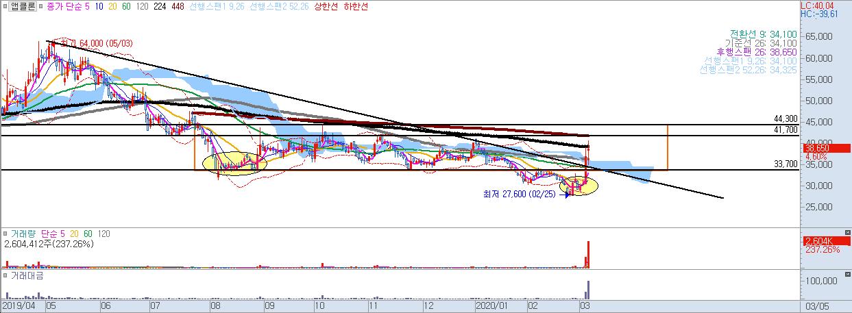 : 41,700원 / 44,300원이 저항선으로 작용할 것으로보이며, 장기 이동평균선의 매물을 강하게 돌파해주고 안착하는지 여부가 중요.