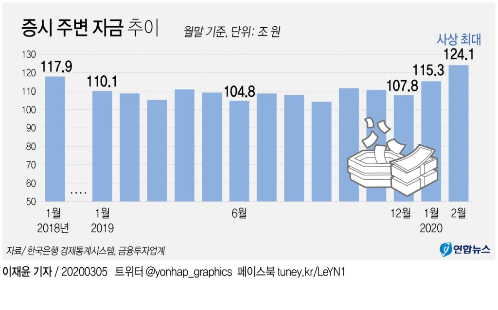 코로나19 감염사태가 전세계로 확장국면으로 가면서 중국을 제외한 대부분의 증시가 하락이 나오고 있는 와중에, 한국증시는 국내에서 코로나19 확진자가 최초로 발생한 1월 20일 이후 이달 5일까지 개인의 수급만 약 9조원이 들어왔습니다. 엄청난 자금력입니다. 매번 분석 포스팅에서 언급드렸듯 대기하고 있는 1500조원의 부동자금의 흐름이 들어오는 것으로 볼 수 있으며, 현재 추정되는 증시주변자금은 124조 정도로 사상최대치를 기록하고있습니다.