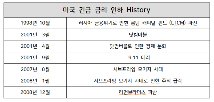 위 미국의 긴급 금리 인하 역사를 살펴보게 되면, 2001년 9월 9.11 테러를 제외하고는 모두 경제위기에서 오는 긴급금리인하였습니다.