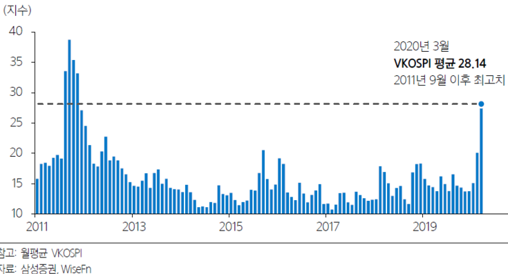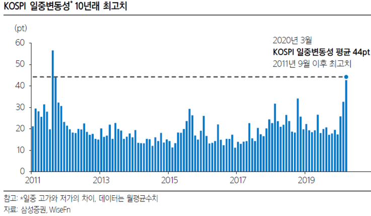 현재 한국증시는 KOSPI 기준으로 공포 수치가 2011년 9월 이후 최고치를 달성하고 있으며, 일중변동성은 10년래 최고치를 달성하고 있습니다.