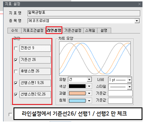 (3,4) : 수치는 되도록 건들지 말고, 라인설정에서 기준선26/선행1/선행2 만 체크하고 색상은 알아서 선택