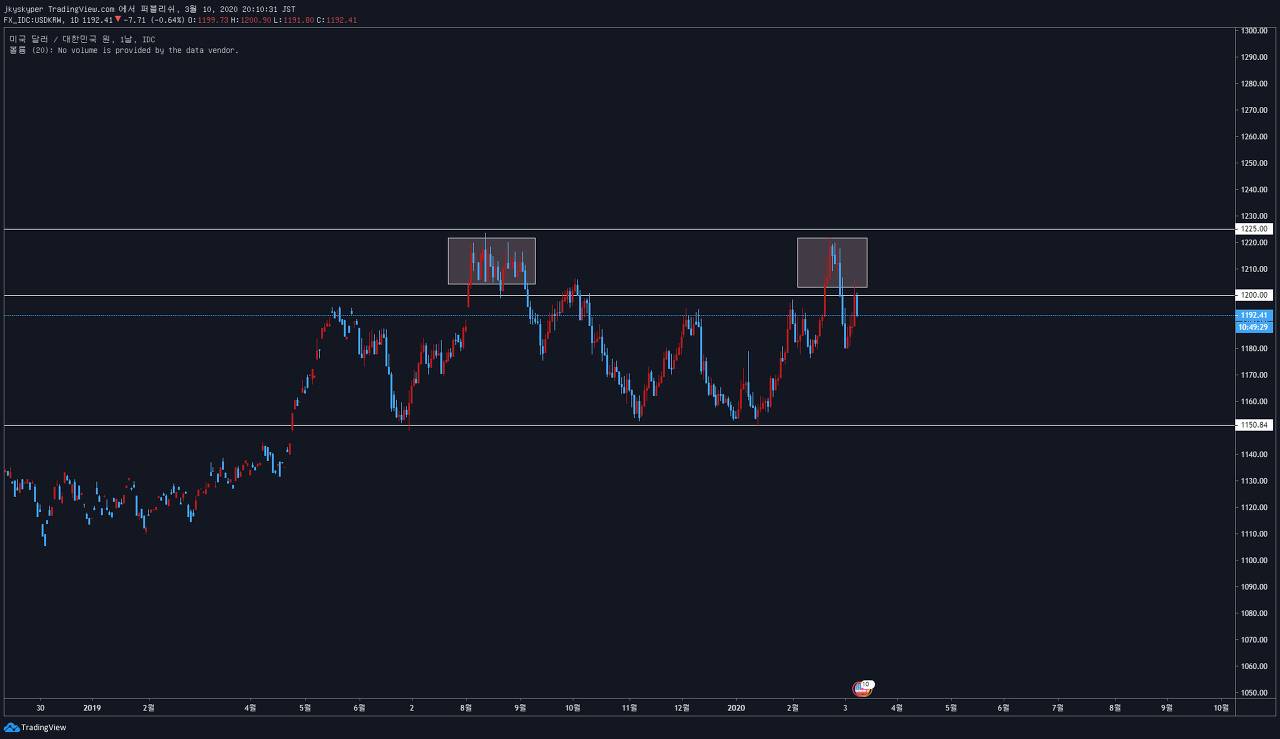 저번에 환율 분석에도 언급드렸듯, 원달러 환율의 경우는 1,200원을 돌파하게 되면 1,200원~1,250원 구간에서 오래 버티지 못하고 다시 1,100원대로 회귀하는 양상을 지속적으로 보여주고 있는데, 이 말인 즉슨, 환율의 경우 1,200원 구간에서 악재가 대부분 소멸하며 1,100원대로 진정세를 보여주고있습니다.