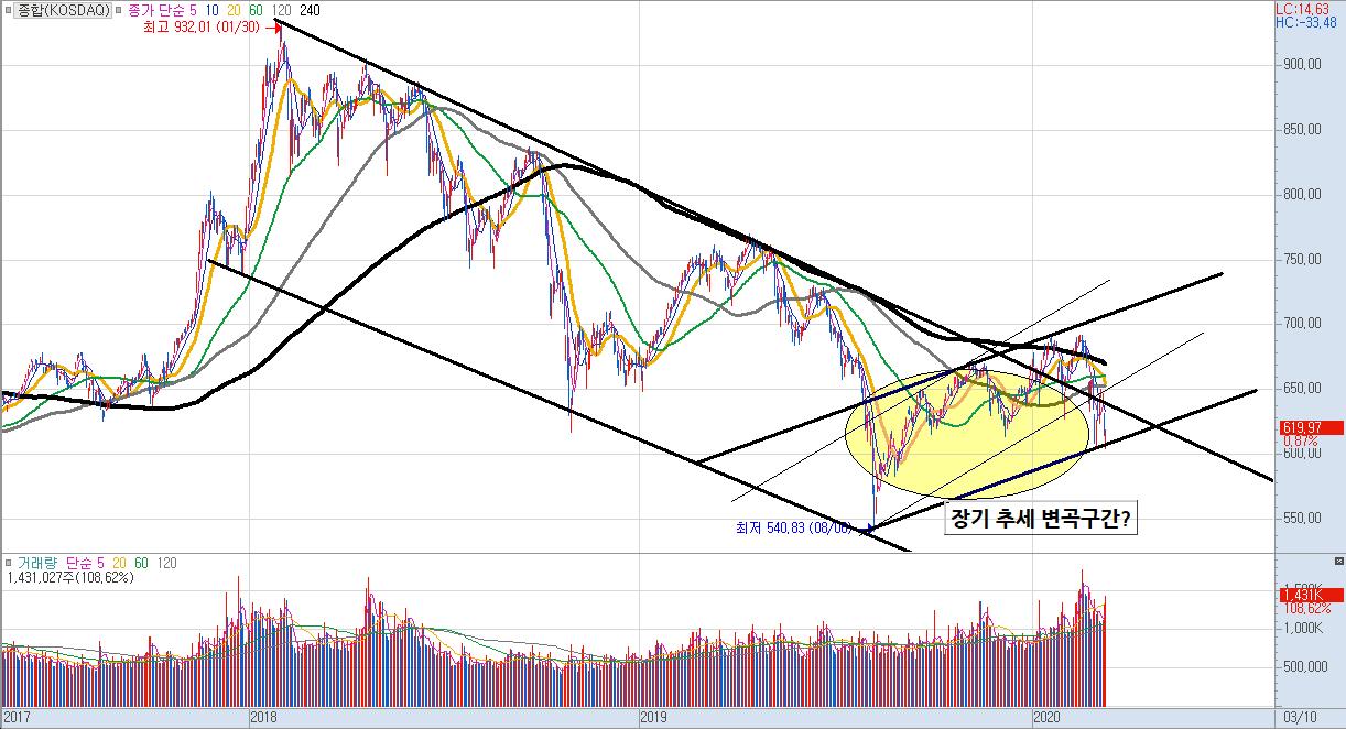만약 변곡의 도전에 실패하고 600포인트 아래로 추가적인 하락이 나온다면,2019년도에 발생했던 최저 540 포인트 까지는 열려있는 구간입니다.