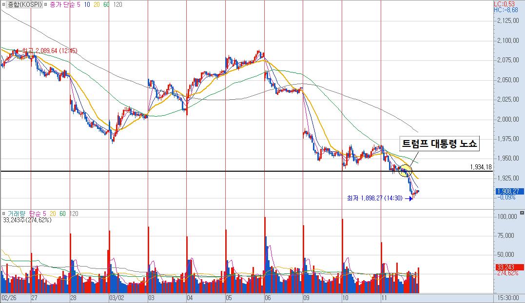 점심 때 쯤 장중에 급락이 나왔었는데, 위에서 설명드렸듯 트럼프 대통령의 기자회견 노쇼가 발생하여 급락이 발생한 구간입니다. 이후 주가는 지속해서 하락을 하다가 1,900포인트를 깨고 다시 반등이 나와주긴 하였으나, 내일 지수가 어디까지 하락할지 감히 예상을 할 수가 없네요.