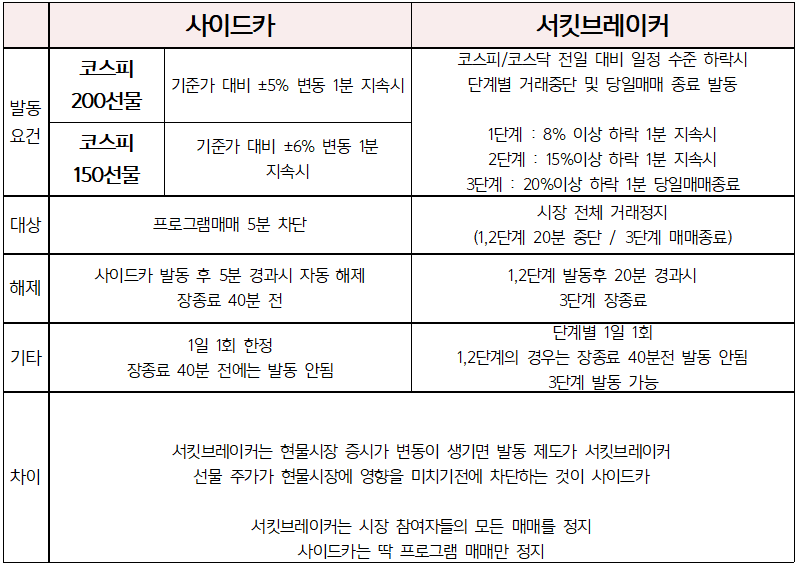 선물 시장에서 발동 되는 것이 사이드카(Sidecar) , 현물 시장에서 발동되는 것이 서킷브레이커(CircuitBreaker) 라고 보시면 되며, 사이드카는 옐로카드의 성격, 서킷브레이커는 레드카드의 성격을 띄고 있다고 비유가 가능하겠네요.