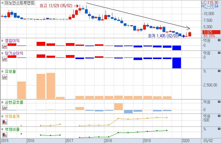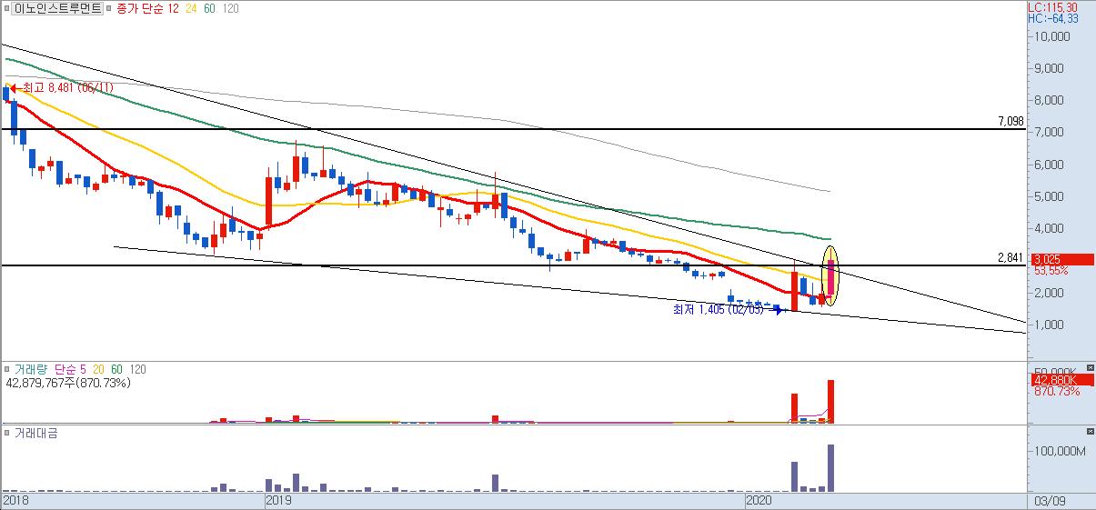 여하튼, 이노전기유한공사라는 자회사를 설립 이후 미중무역분쟁등 여러 국제정세가 안좋게 터지면서, 국내 이노인스트루먼트 종목은 우하향 추세로 지속중에 있다가 최근에 차트적으로는 유의미한 흐름이 나와 관심종목으로 추가하게 되었습니다.