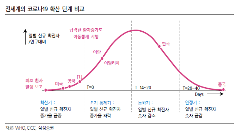 한국도 현재 둔화기 상태를 진입 하고 있으나, 집단 감염이 지속적으로 나오는 상황에서 긴장을 늦춰서는 안되는 구간이며, 아직까지 유럽이나 미국은 코로나19 에 대한 위기의식이 별로 없는 것으로 확인된다.