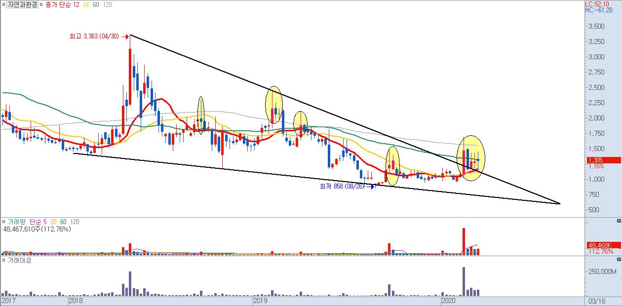 대부분의 종목이 한국 증시 지수와 동행을 하면서 급락을 보여주었지만, 자연과환경은 '일단' 가격대를 방어해주고 있다는 측면에서 여타 다른 매수 자리보다 나름 긍정적인 관점을 가져 볼 수 있겠다.