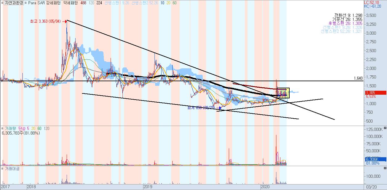 좀 더 확대를 해보면, 단기적으로도 2월달부터 상승추세를 만들고있고, 지수가 급락하는 상황에서도 1,140원 ~ 1,400원의 가격박스를 지켜주고 있는 상태이다.