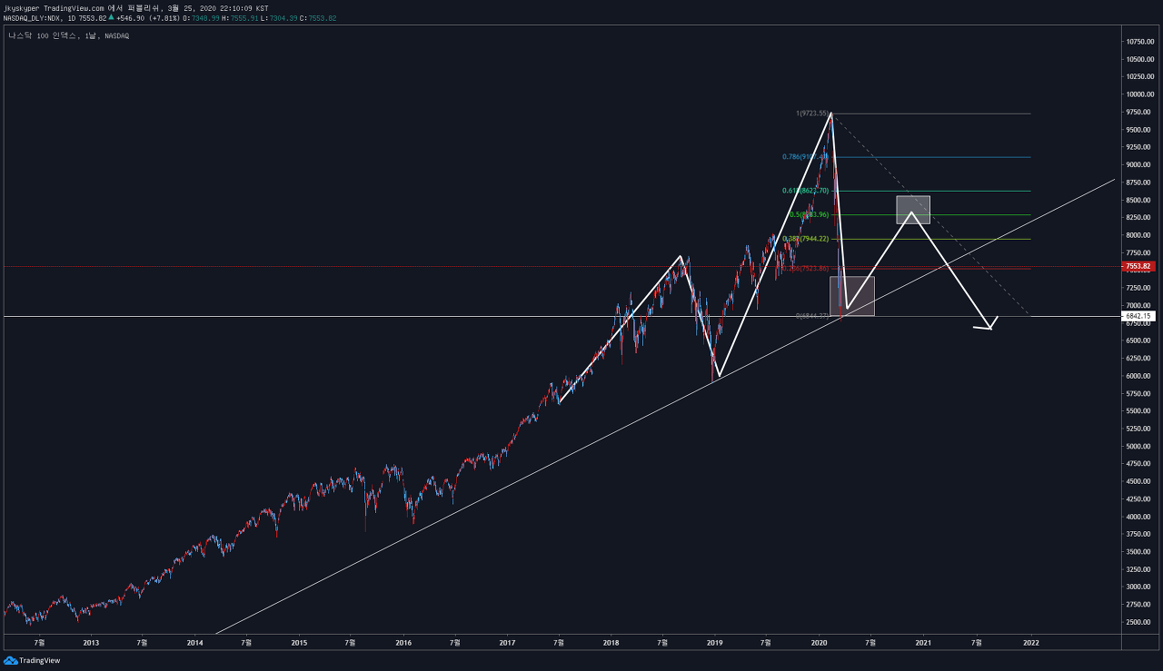 하단 추세선이 현재 Neckline 으로 만들어지는 헤드앤숄더 패턴이 만들어질 수도있기에, 슈퍼 경기부양책으로 일단 패닉은 진정을 시켰고, 중장기적으로 다시 추세를 유지하기 위해서는 궁극적인 목표인 코로나19 치료제가 제일 중요할 것.