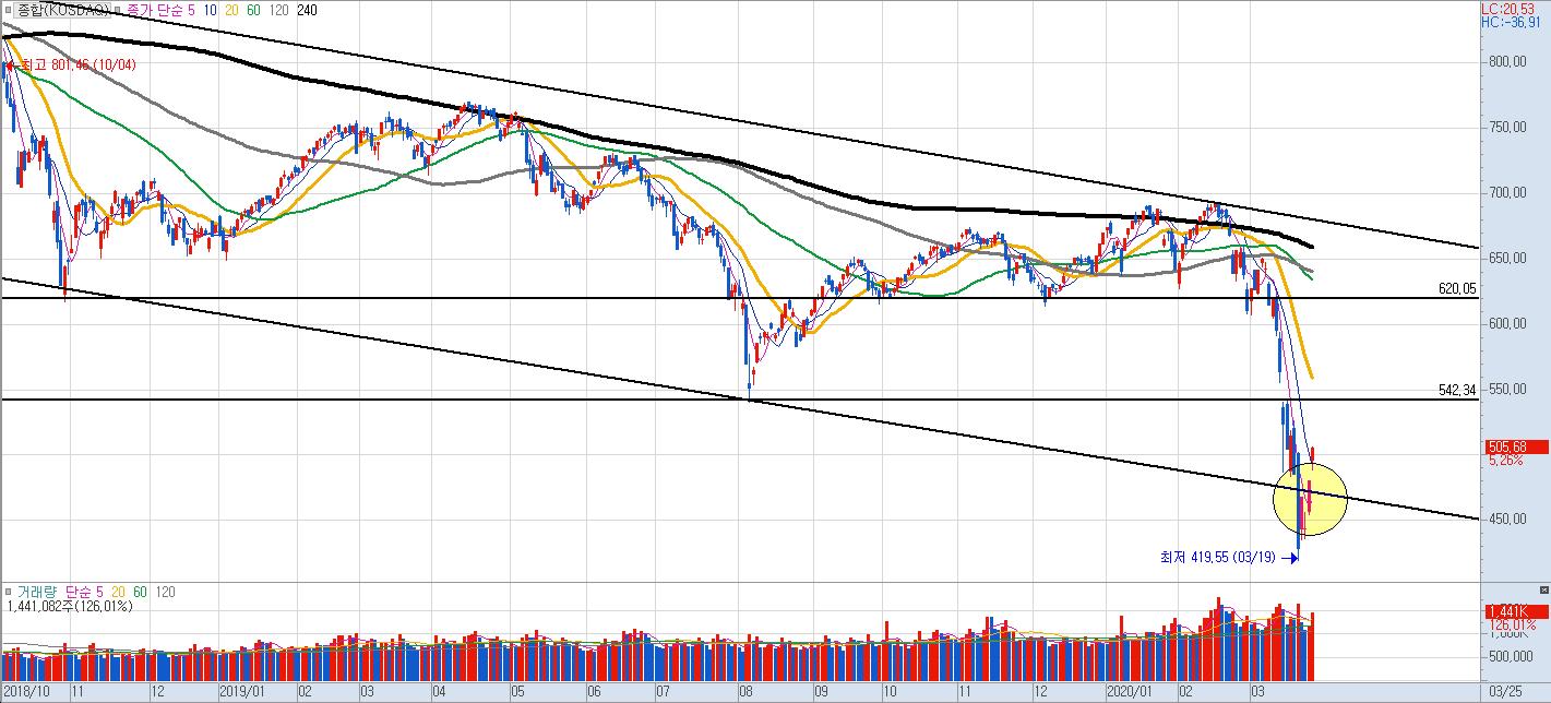 코스닥은 일단 하단 추세선을 이탈하면서 낙폭과대의 흐름이 나왔으나, 다행히 단기간에 회복되어주고 오늘은 큰 갭상승으로 마무리.