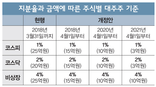 현재 주식 양도소득세 과세 대상 대주주의 기준이 되는 종목별 보유액은 코스피, 코스닥 모두 15억원 이상이며, 지분율은 코스피는 1%, 코스닥은 2% 이상