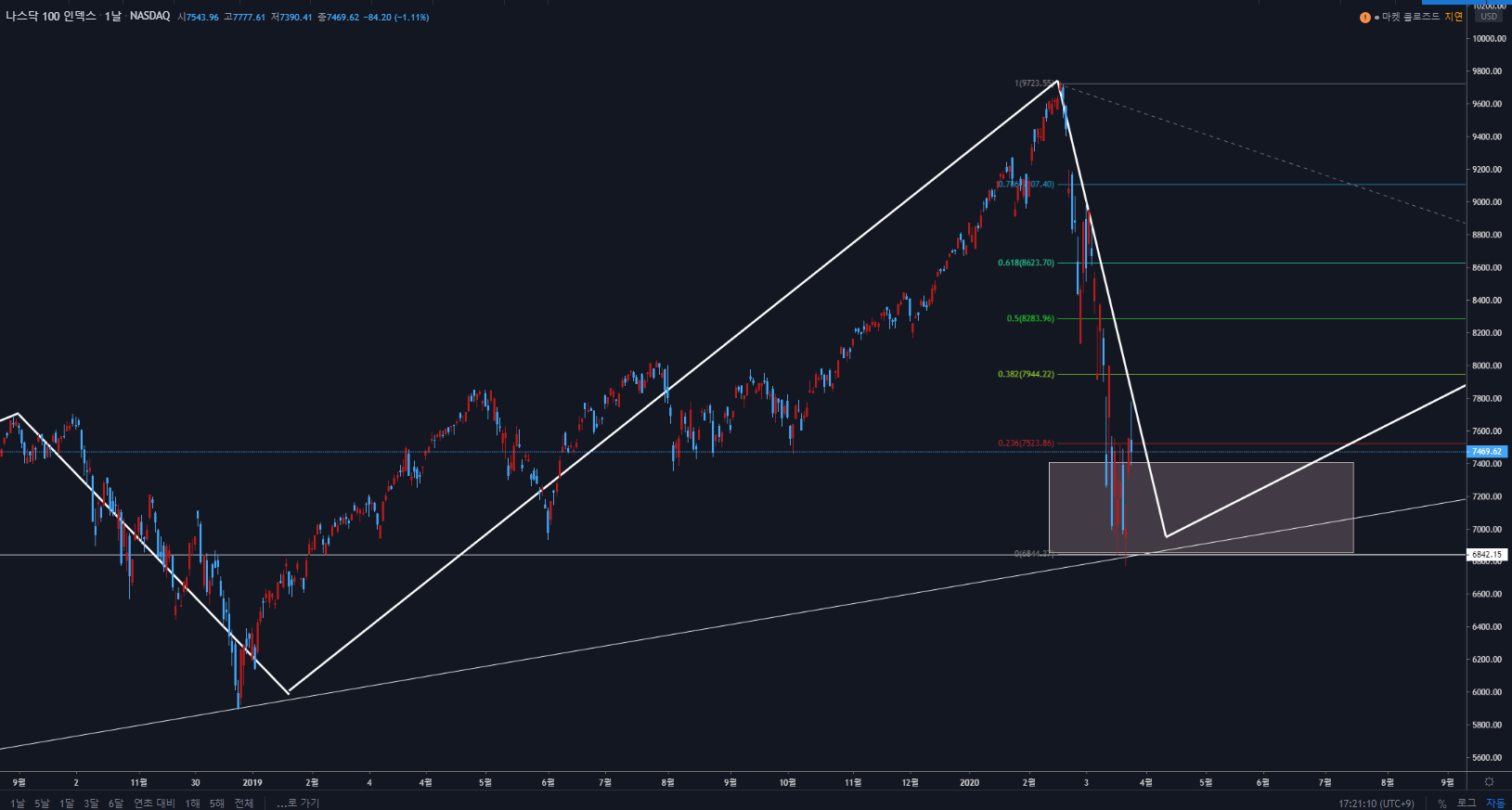 일단 나스닥에서 흥미롭게 살펴볼 점은 7,523 포인트, 피보나치 되돌림으로 고점 대비 측정하였을때, 0.236 선을 장중에는 돌파하였으나, 장 막판에 급락이 나오면서 아래에서 마감.