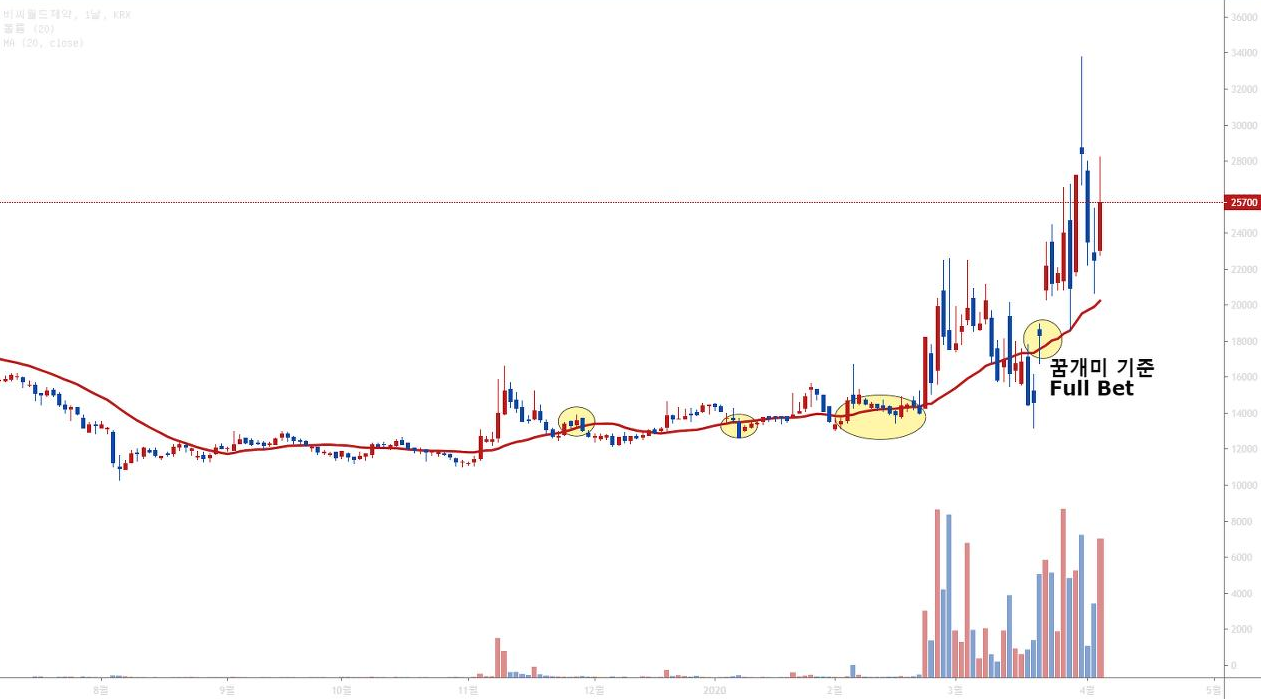 위에서 같이 20일선 상승추세에서 진입하면 더욱 승률은 높아지겠으나,