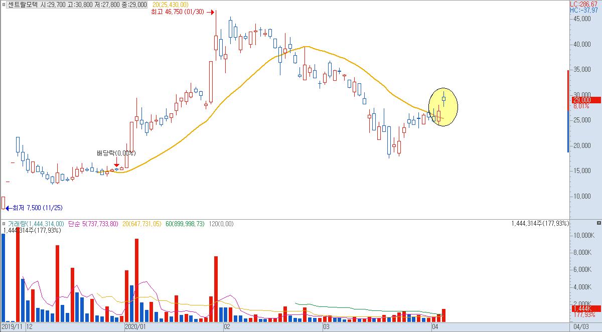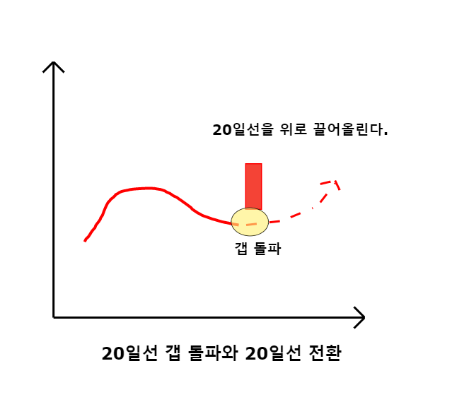 2) 20일선이 약 우하향 추세에 있다가 갭으로 돌파하면 20일선도 우상향을 시도한다.