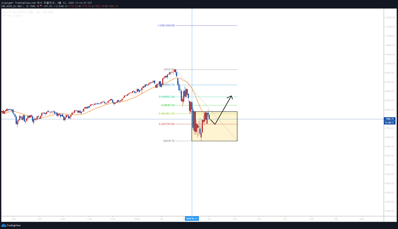 3월 중순 저점을 찍고 V자 반등을 보여주는 것인가!! 동학개미운동의 승리인건가!! 라는 기대감을 갖게 만드는 엄청난 상승 파동이 등장을 하였으나.. 나스닥 선물/현물 차트와 마찬가지로 0.382 구간에서 밀리고, 20일선을 돌파에 실패를 하면서 종가저가 캔들로 마감을 하였다.