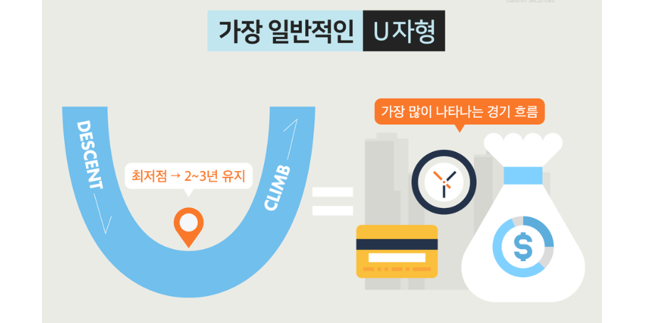 : 빠른 경기침체 이후, 장시간에 걸쳐서 상승 추세를 통한 회복을 하는 패턴